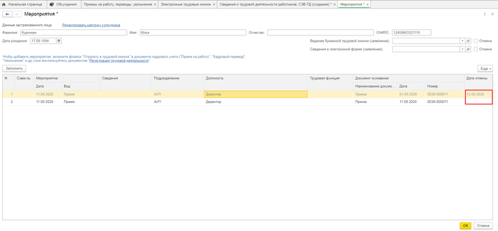 Так же для корректировки данных можно воспользоваться документом Регистрация трудовой деятельности. Для изменения ранее зарегистрированных мероприятий (дата мероприятия и приказа должна быть раньше, чем дата документа Регистрация трудовой деятельности). Провалившись по кнопке "Отменить", слева выводится список сотрудников, по которым были зарегистрированы кадровые мероприятия, а в правой части перечисляются кадровые мероприятия по конкретному сотруднику.