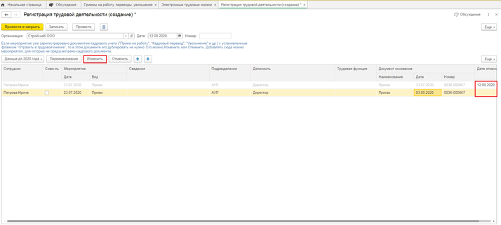 При выборе мероприятия, которое необходимо изменить, в документе заполняются две строки – одна с отменой ранее зарегистрированного мероприятия (по умолчанию дата отмены равна дате документа Регистрация трудовой деятельности, при необходимости можно изменить) и вторая с такими же данными, но в которую можно вносить требуемые изменения. Кнопка Провести и закрыть. Сведения, которые были изменены, будут отражены в форме СЗВ-ТД автоматически при последующем их формировании. В форме появляется строка с признаком отмены ранее переданных сведений и строка с корректными сведениями. Эти строки будут отражены в следующем отчете СЗВ-ТД только в случае изменения информации в кадровом документе, которая отражается в трудовой книжке.