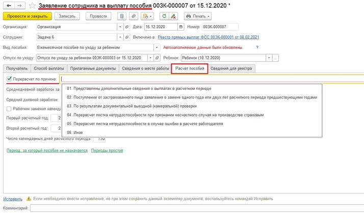В 1С:Предприятие, корректировочного реестра не предусмотрено, но тем не менее такую пометку мы можем поставить. Чтобы отправить новый реестр прямых выплат ФСС с видом корректировки/дубликат необходимо создать новое заявление сотрудника на выплату пособия, где на вкладке «Расчет пособия» ставите галочку «Перерасчет по причине» и выбираете причину (рис.1). Все остальные данные будут, как и в первоначальном заявлении. Далее создаете новый реестр прямых выплат, там подцепляете новое заявление и его отправляете.
