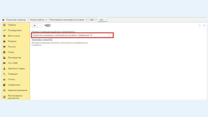 Для того, чтобы счета-фактуры нумеровались с префиксом «А» необходимо зайти в раздел «Банк и касса» - Регистрация счетов-фактур - Счета-фактуры на аванс . Открывается регистрация счетов-фактур на аванс. Внизу документа ссылка «Нумерация счетов-фактур», открываем ссылку, в «порядке нумерации выданных счетов-фактур» выбираем «Отдельная нумерация счетов-фактур на аванс с префиксом "А"».