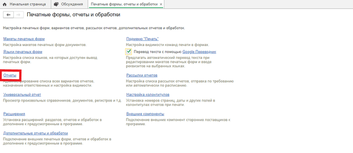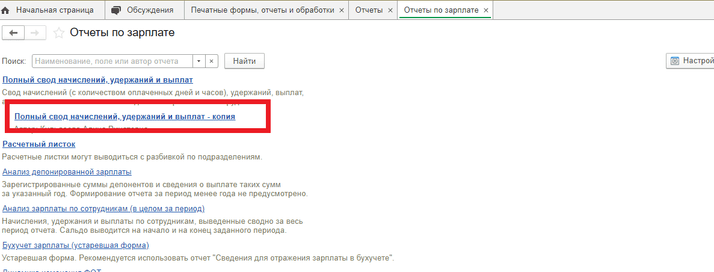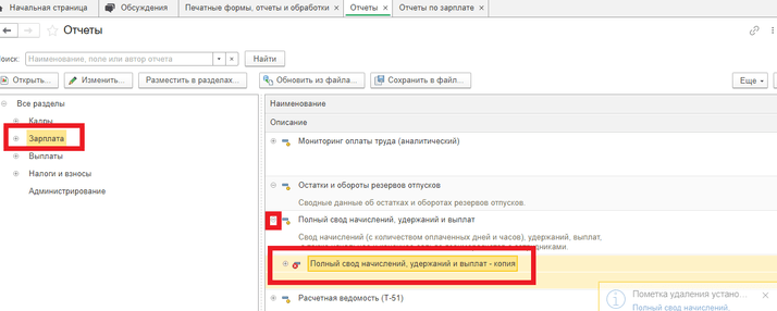 Для удаления созданных пользователей вариантов различных кадровых и зарплатных отчетов, сначала необходимо пометить их на удаление. Для этого перейдите в раздел «Администрирование» - « Печатный формы, отчеты и обработки» перейдите по гиперссылке «Отчеты». Из списка раскройте раздел, где был создан отчет, и по «плюсику» раскройте все варианты этого отчета, выделите созданный вариант и пометьте на удаление.