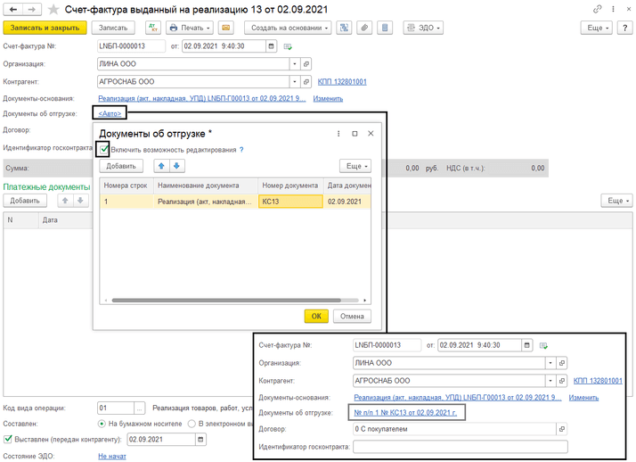 При этом в УПД номер документа об отгрузке не редактируется, так как совпадает с номером УПД.