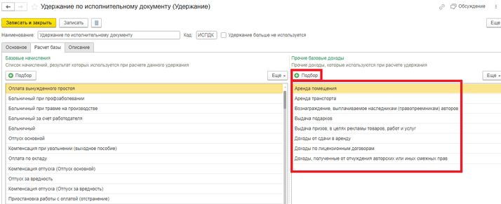 Необходимо перейти в раздел «Настройка» в пункт «Удержания», в списке найти «Удержание по исполнительному документу», открыть его. Раскрыть вкладку «Расчет базы» и в правом столбце «Прочие базовые доходы» по кнопке «Подбор» добавьте все необходимые прочие доходы. Сохраните изменение.
