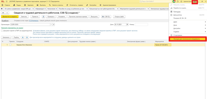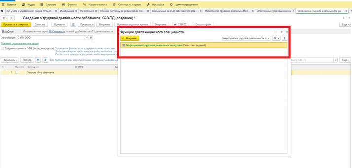 Для того чтобы снять «Отмену» с данных мероприятий, необходимо перейти в «Сервис и настройки». Далее в списке выбираем «Функции для технического специалиста», в открывшемся окне в поиске пишем «Мероприятия трудовой деятельности прочие» выбираем регистр сведения, который отобразился в списке.