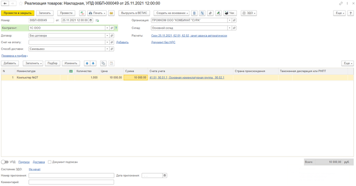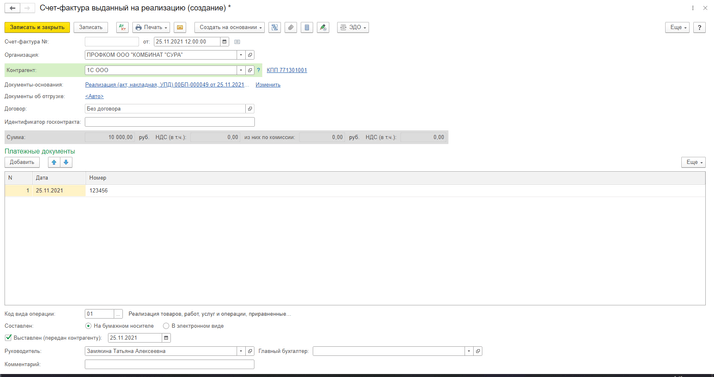 Чтобы в печатной форме «УПД» была заполнена графа 5 «К платежно-расчетному документу №» необходимо выполнить следующую последовательность действий: