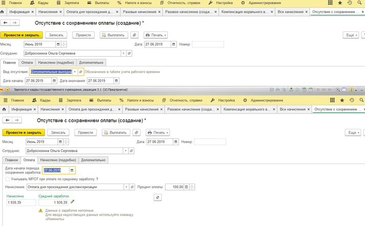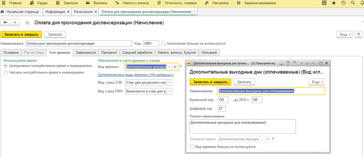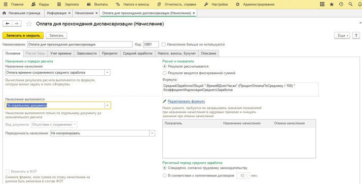 Создаете новый вид начисления «Оплата дня прохождения диспансеризации».