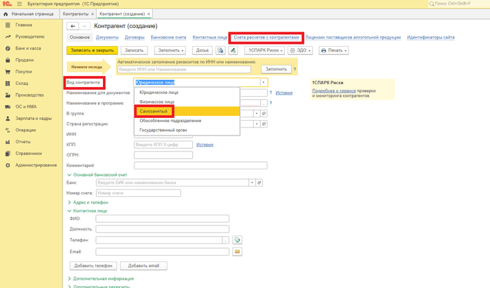 В разделе «Справочники» - «Контрагенты» - создаем контрагента и выбираем вид контрагента «Самозанятый». По ссылке «Счета учета расчетов с контрагентами» указываем «Счет расчетов с поставщиком» и «Счет авансов выданных» —76.09 «Прочие расчеты с разными дебиторами и кредиторами».