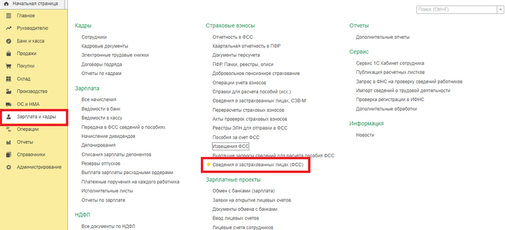 Для того чтобы сформировать и отправить «Сведения о застрахованном лице» без привязки к больничному листу необходимо перейти в раздел «Зарплата и кадры», в подразделе «Страховые взносы» теперь есть пункт «Сведения о застрахованных лицах (ФСС)» переходим в него.