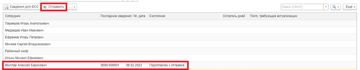 В рабочем месте «Сведения о застрахованных лицах (ФСС) будут карточки всех сотрудников (даже уволенных). Открыв сведения каждого сотрудника, необходимо сделать проверку на корректность передаваемых сведений, после «Провести» документ, так сведения будут в статусе «Подготовлен к отправке». После, по активной кнопке «Отправить» произведите передачу данных.