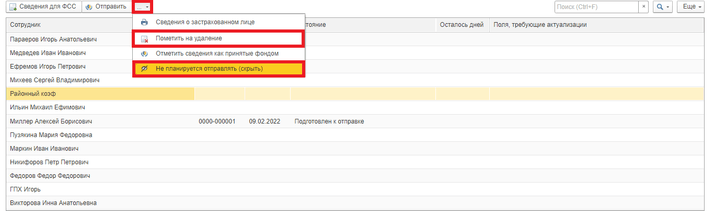 Уволенных сотрудников, можно выделить и по кнопке «Подменю еще сведений» выбрать «Пометить на удаление» или «Не планируется отправлять (скрыть)».