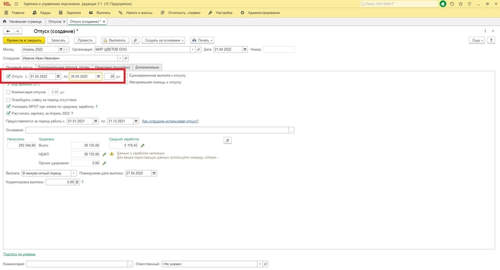Например, зарегистрируем отпуск с 1 мая на 28 дней. В программе 1С: Зарплата и управление персоналом, ред. 3.1 при создании документа «Отпуск» указываем период отпуска с учетом праздничных дней, т.е. дату окончания отпуска переносим, количество дней отпуска скорректируется автоматически.
