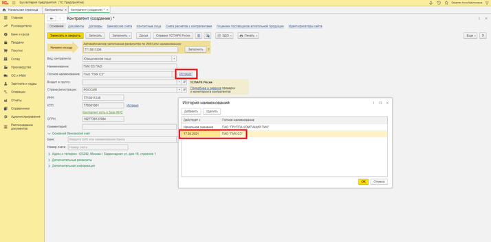 Для того, чтобы в программе 1С: Бухгалтерия предприятия, ред. 3.0 изменить наименование контрагента, необходимо перейти в раздел «Справочники» – «Контрагенты» – «Полное наименование». По ссылке «История» добавить новую строку и указать новые наименование с определенной даты.
