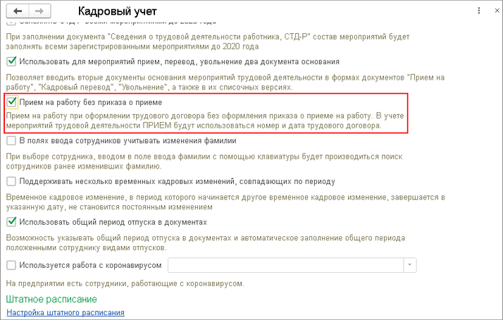 Для этого в настройках кадрового учета (раздел «Настройка» – «Кадровый учет») установите флажок «Прием на работу без приказа о приеме».