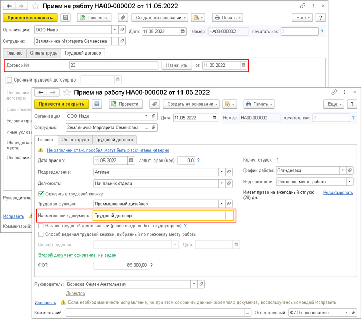 После установки флажка в документе «Прием на работу» становится обязательным указание номера и даты трудового договора (закладка «Трудовой договор»). На закладке «Главное», в поле «Наименование документа» выберите документ «Трудовой договор».