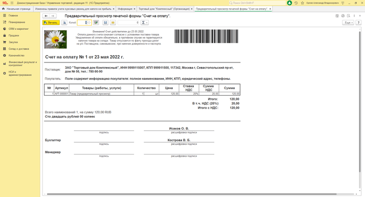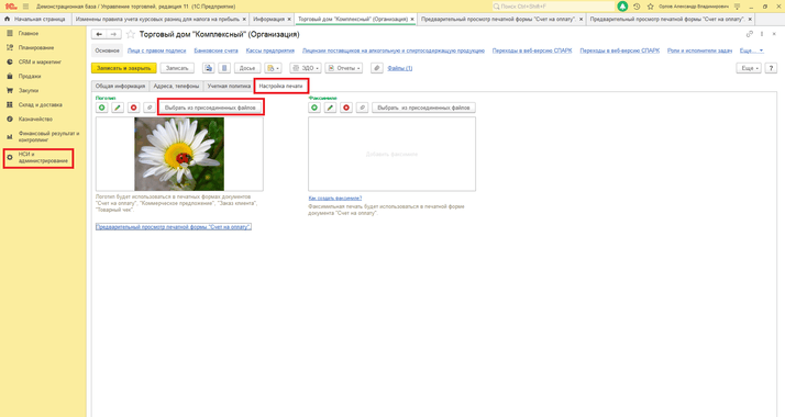 Для того чтобы в счете на оплату отражался логотип компании, необходимо перейти в меню «НСИ и администрирование», подраздел «НСИ» - «Организации» - закладка «Настройка печати». Далее нажимаем «Выбрать из присоединенных файлов» и выбираем картинку, загружаем. Ниже по ссылке можно вывести предварительный просмотр печатной формы «Счет на оплату».