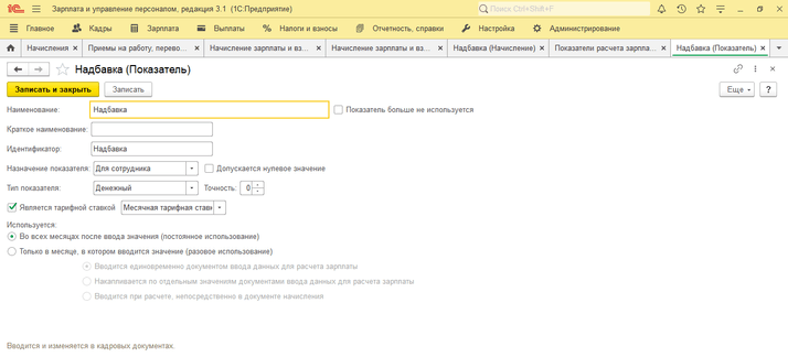 В поле «Расчет и показатели» установить переключатель «Результат рассчитывается» вводим формулу: Надбавка*ДоляНеполногоРабочегоВремени * ВремяВДнях / НормаДней