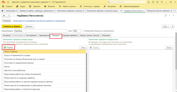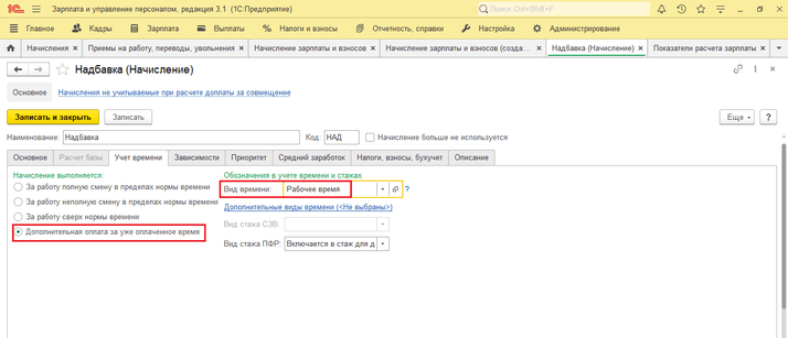 Наряду с основными начислениями в программе 1С:Зарплата и управление персоналом, ред.3.1 могут быть предусмотрены надбавки. Для того чтобы ежемесячно начислять надбавку пропорционально отработанному времени, необходимо задать следующие настройки: