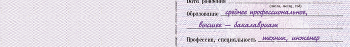 Когда изменяются сведения об образовании или профессии, специальности работника, зачеркивания не допускаются. Новые сведения просто укажите рядом с предыдущей записью (п. 8 Порядка ведения трудовых книжек).