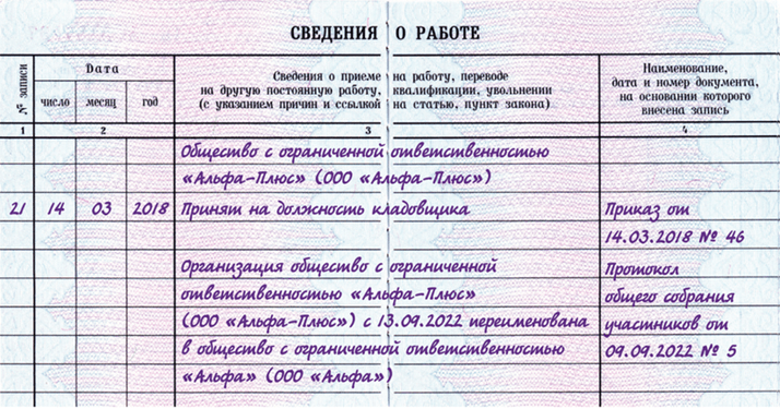 Если в период работы сотрудника у организации изменяется наименование, это отдельно указывают в разделе «Сведения о работе». В трудовую книжку внесите запись (п. 13 Порядка ведения и хранения трудовых книжек):
