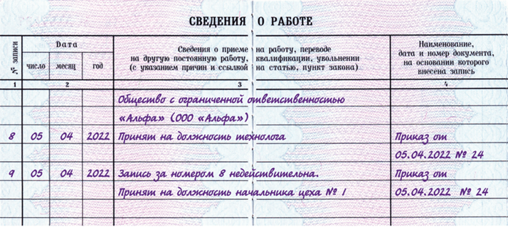 Исправления не допускаются, даже когда необходимо исправить только номер или дату. Во всех случаях, включая записи о приеме, переводе и увольнении, вносите запись о признании неверной записи недействительной, затем правильную информацию (п. 12 Порядка ведения трудовых книжек).