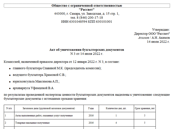 Члены экспертной комиссии также подписывают акт об уничтожении документов. После этого акт утверждается руководителем организации.