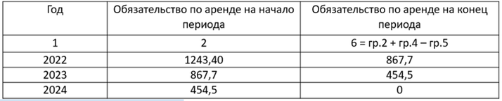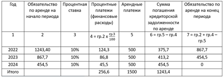 2022 г.: долг на начало года равен 1 243,4, и в течение года набежали проценты (10 % от 1 243,4) 124,3. Обязательство по аренде увеличилось на сумму процентов до 1 367,7 (1 243,4 + 124,3). Платим 500. Обязательство по аренде уменьшается до 867,7 (1 367,7 – 500).