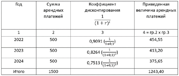 Таблица 1. Расчет приведенной стоимости будущих арендных платежей