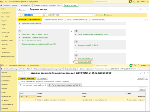 Осуществляется в автоматическом режиме, когда выполняется операция «Зачет аванса по единому налоговому счету». Отображаются данные непосредственно в рамках обработки по закрытию месяца. Отдельного внимания заслуживают операции накопления «Расчеты по единому налоговому счету», «Расчеты по налогам на едином налоговом счете». Их принято выполнять с отображением движения средств, с видом «Расход». Также стоит отметить, движение с видом «Приход» по указанным регистрам формируется ранее, когда проводятся документы «Уведомление об исчисленных суммах налогов», «Списание с расчетного счета».