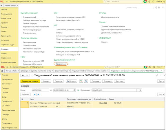 Обязательным является подача уведомления с учетом того, что авансовые платежи обязательно перечисляются в бюджет непосредственно до формирования и предоставления декларации по налогам. В рамках создания документа осуществляются проводки по счету 68.90, а также отображаются движения активов по текущему регистру накопления «Расчеты по налогам на едином налоговом счете» с непосредственным отображением в графе «Приход».