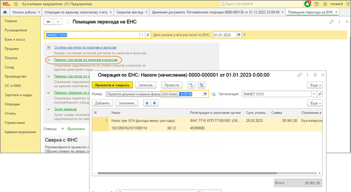 Чтобы выполнить перенос данных на установленный «Единый налоговый счет», а также сформировать общую налоговую обязанность, потребуется использовать соответствующий документ «Операция по ЕНС». В данном случае уведомление по налогу не будет подаваться с учетом того, что перечисление платежа осуществляется непосредственно после предоставления декларации. К примеру, чтобы перенести задолженность по налогу за прошедший 2022 год, потребуется использовать опцию «Помощник перехода по ЕНС», который доступен через раздел «Операции» (рис. 2).