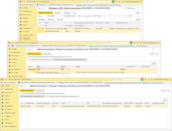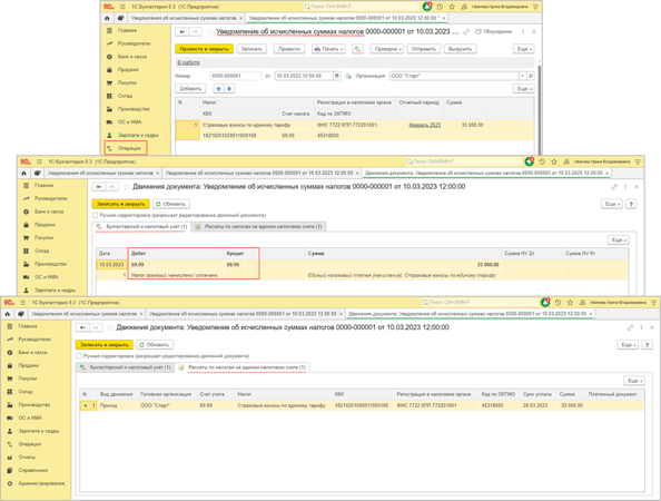 Отобразить движение этих документов можно за счет проводок по кредиту счета 68.90. Такие проводки должны корреспондировать со счетом 69.09, где отдельно учитывается каждый страховой взнос. Также требуется соответствие движениям в накопительном регистре «Расчеты на едином налоговом счете» в категории «Приход» (рис. 2, 3).