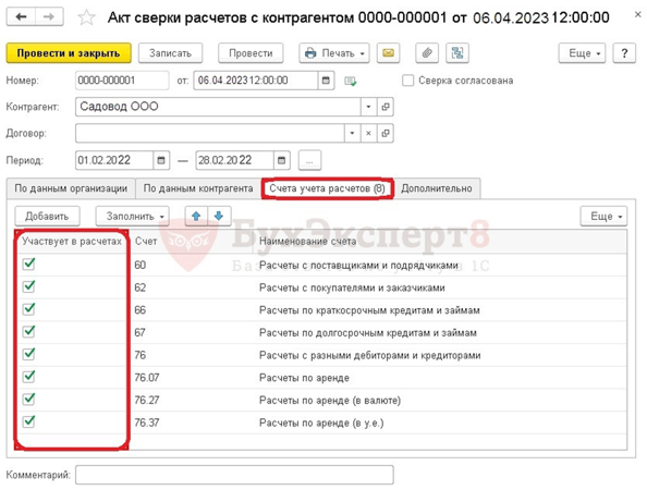 - «Счета учета» – Показан список бухгалтерских счетов, по которым ведутся расчеты. Если для контрагента есть особенности в учете, то счета соответственно надо добавить либо убрать из списка. Так, например, если контрагент одновременно является и покупателем, и поставщиком, а сверку с ним надо произвести как с поставщиком, то в списке целесообразно оставить только 60 счет. И тогда в акт не подтянутся данные по другим счетам.