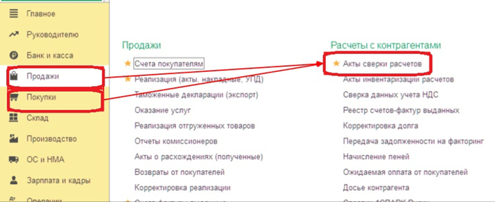 В программе 1С 8.3 сформировать акт сверки с контрагентами можно с помощью одного из пунктов меню: «Продажи» или «Покупки», затем выбрать команду – Акты сверки расчетов.