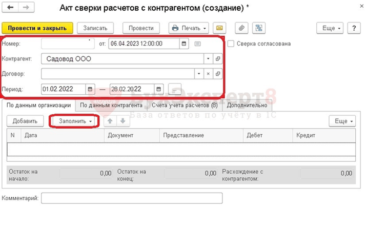 - «По данным контрагента» – при начальной исходящей сверке эта вкладка не заполняется. Или, как дополнительное действие, для удобства и по согласованию со сверяемым предприятием её можно сформировать.