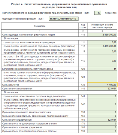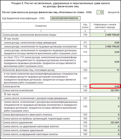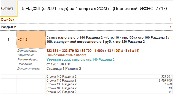 Аналогичное расхождение будет в форме 6-НДФЛ: 2489700 – 1400 = 323479 (рис. 7).
