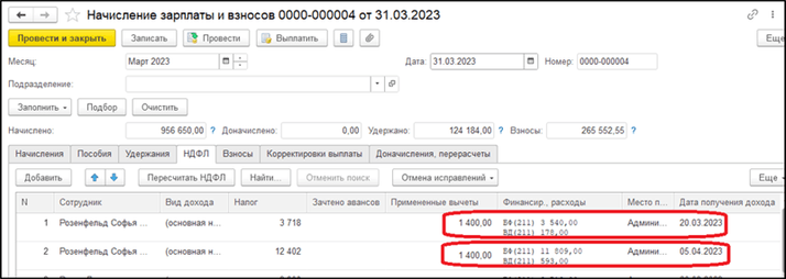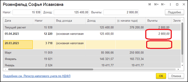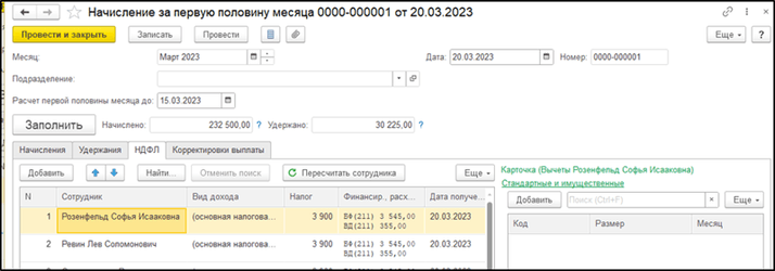 После выплаты аванса Розенфельд С. И. предоставила заявление 29.03.2023 на стандартный вычет. При расчете зарплаты за март будет предоставлен вычет за март по строке расчета «НДФЛ с аванса» и за апрель по строке «НДФЛ с окончательного расчета» (рис. 4).