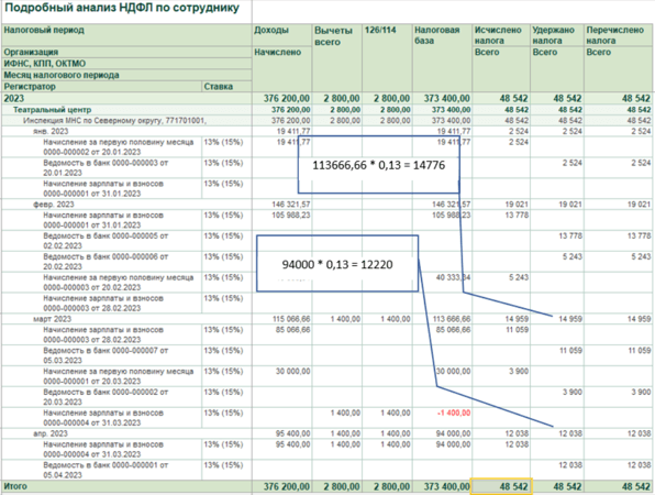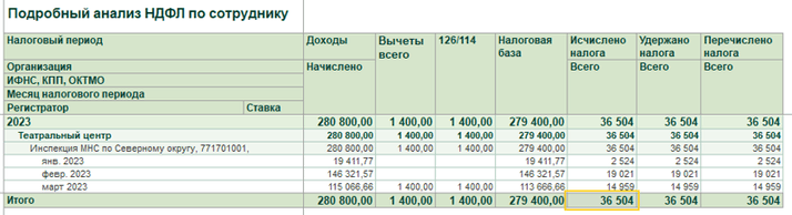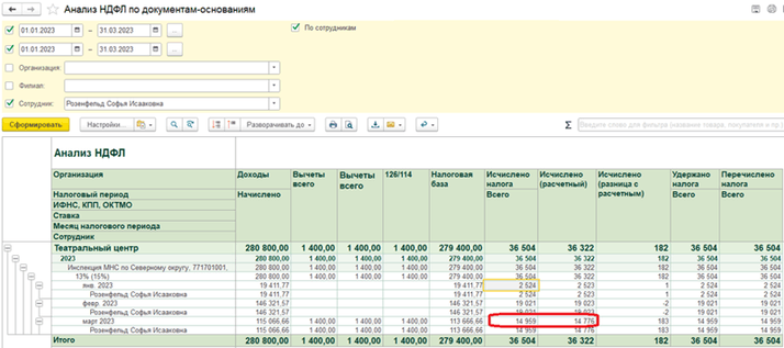 Проверяем итоговые показатели за первый квартал: 279400 × 0,13 = 36322. Они отличаются от суммы исчисленного НДФЛ (рис. 6).
