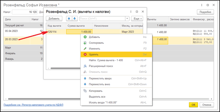 Чтобы исправить ситуацию, необходимо перенести вычет из марта в апрель. Для этого в документе «Начисление зарплаты и взносов» за март в расшифровке НДФЛ необходимо вручную скорректировать вычеты между месяцами. Выполнение данных действий требует аккуратности и внимательности (рис. 8, 9, 10).
