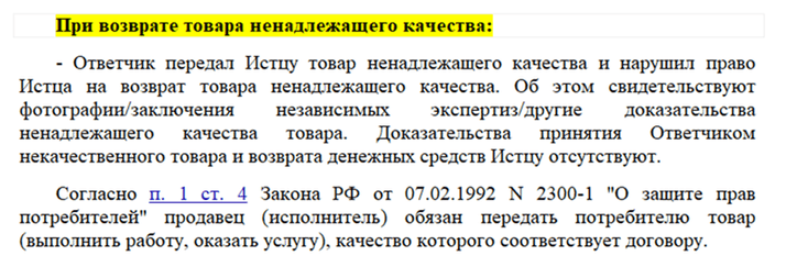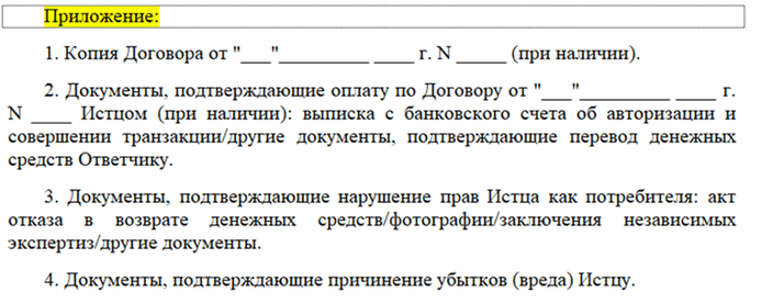 В части формулировки своих требований затруднений также не возникло. Все требования, которые истец может предъявить в случае возврата товара ненадлежащего качества, приобретенного дистанционным способом, были в образце иска. Перечень документов, которые необходимо приложить к иску, установлен в образце, поэтому мне оставалось только указать реквизиты этих приложений.