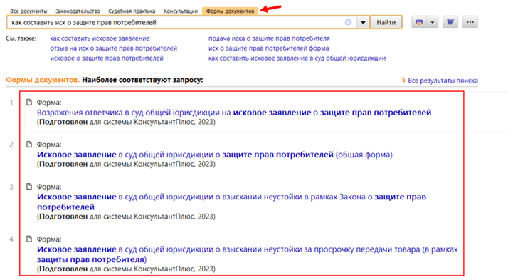 Оставалось найти исковое заявление и заполнить его. Не меняя поисковый запрос, я открыла вкладку «Формы документов».