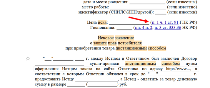 Шапку искового заявления со сведениями о суде, сторонах, цене иска и государственной пошлине я заполнила с помощью пошаговой инструкции, о которой я рассказывала выше. Плюс рассчитать цену иска и размер госпошлины мне помогли содержащиеся в образце иска активные ссылки на статьи нормативно-правовых актов.