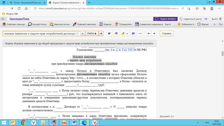 У нас в компании есть система КонсультантПлюс, а у меня есть доступ. Я подумала, что скачаю иск в системе и заполню. Вот что я сделала.