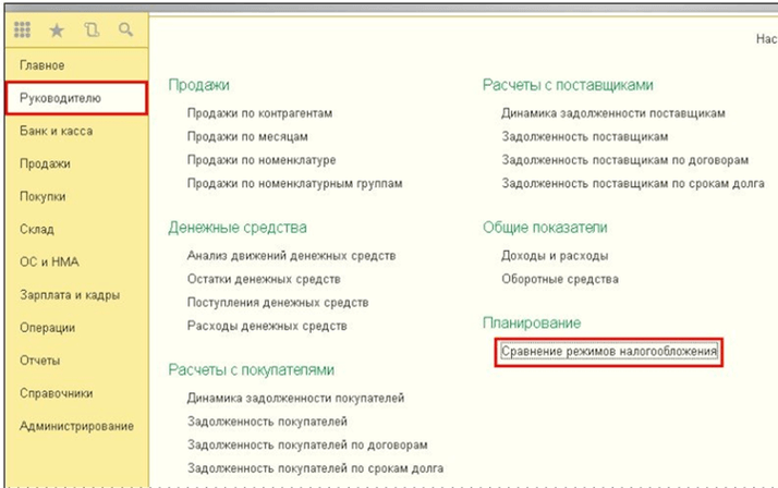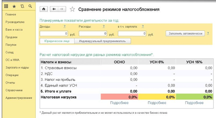 В 1С:Бухгалтерия 8.3 для помощи в выборе режима налогообложения встроен специальный Помощник, который сделает предварительную оценку налоговой нагрузки бизнеса.