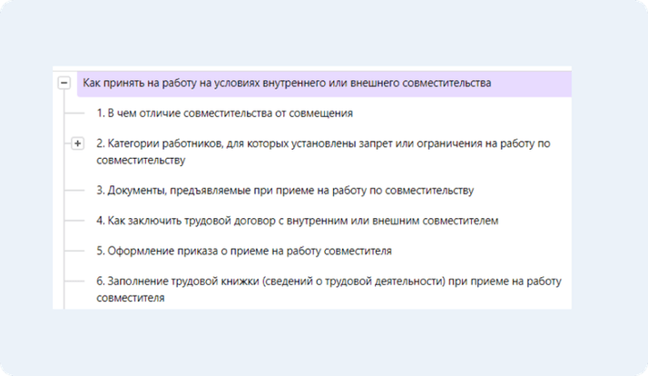 Например, вам необходимо принять на работу совместителя. Находим нужный Путеводитель. Каждый Путеводитель — это, по сути, пошаговая инструкция. Материал в нем ежедневно обновляется. В нем учтены требования действующего законодательства, а также актуальные разъяснения органов власти. Так как любая кадровая процедура требует грамотного оформления документов, в Путеводителе есть все нужные образцы заполнения документов.