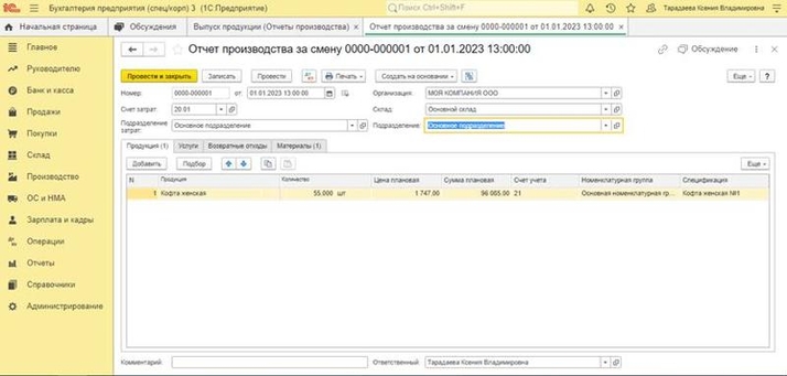 Для того, чтобы отразить выпуск полуфабрикатов, нужно зайти в раздел «Производство». Далее появится список операций. Необходимо выбрать «Выпуск продукции (отчет производства)». Далее нажимаем кнопку создать и выбираем «Выпуск продукции (отчет производства за смену)» В открывшемся окне указываем организацию, дату, склад, счет затрат (счет 20.01 «Основное производство». В строке «Продукция» указываются полуфабрикаты, количество, сумма, а также счет учета , на котором будут учитываться полуфабрикаты (счет 21 «Полуфабрикаты собственного производства»). Во вкладке «Материалы» указываем списываемые в производство материалы.