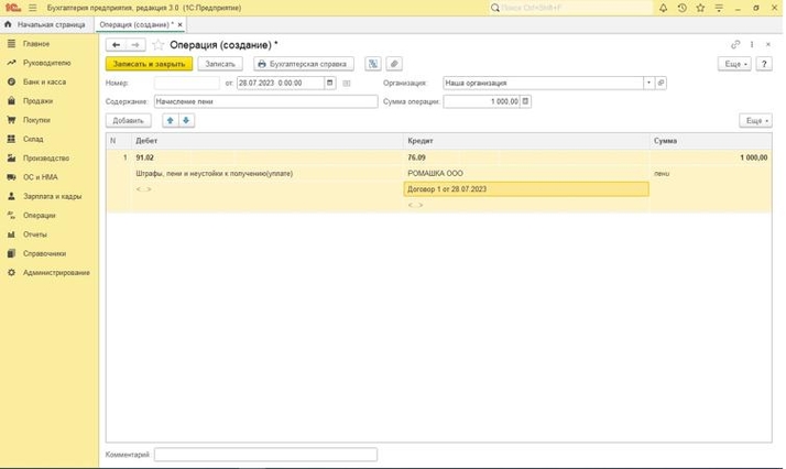 В программе 1С:Бухгалтерия предприятия 8 ред. 3.0 начисленные к уплате пени (штрафы) за нарушение договорных или долговых обязательств отражаются вручную документом «Операция» (Раздел «Операции» – «Операции, введенные вручную»). В колонке «Дебет» выберите счет 91.02 «Прочие расходы» и субконто к нему «Штрафы, пени, неустойки к получению(уплате)». В колонке «Кредит» выберите счет 76.09 «Прочие расчеты с разными дебиторами и кредиторами» и субконто к нему из списка справочников «Контрагенты» и «Договоры». Субконто «Документы расчетов с контрагентом» не обязательно для заполнения. Далее укажите сумму пеней (штрафа).