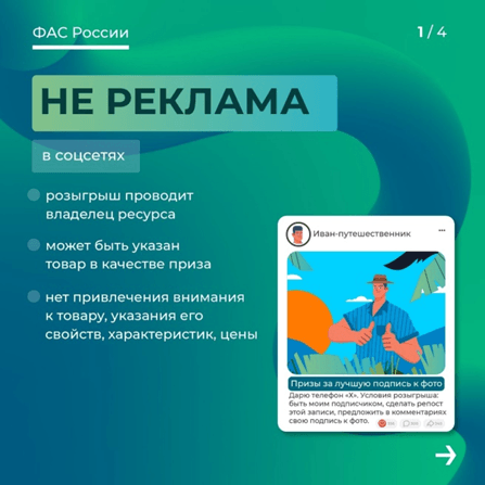 В случаях, когда розыгрыш проводит не владелец ресурса, а приз – это определенный товар партнера, с указанием его подробных характеристик, информацию могут признать рекламой. Это связанно с тем, что в таких публикациях есть объект рекламирования, а также информация направлена на то, чтобы продвигать товар на рынке.