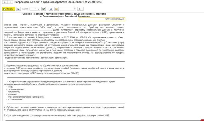 По кнопке «Согласие в документе «Запрос данных СФР о среднем заработке» можно вывести печатную форму согласия сотрудника. Сведения об организации и ответственном за обработку персональных данных заполняются в печатной форме по данным документа. При необходимости эти сведения можно отредактировать в документе вручную.