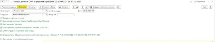 Включить флажок «Сотрудник подписал согласие». Если флажок не установлен, отправить Запрос в Фонд не получится.