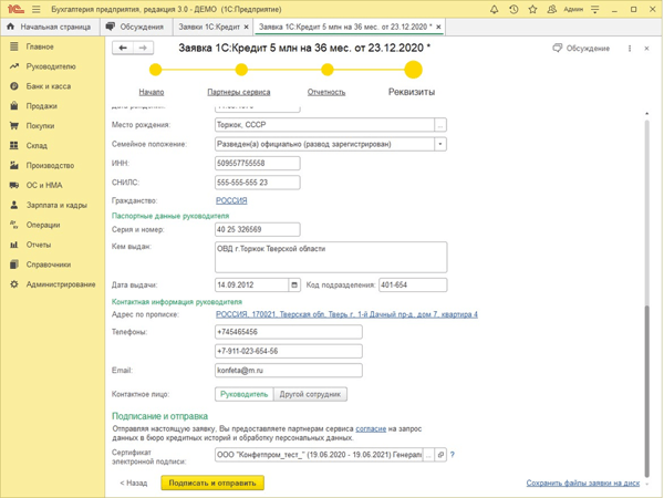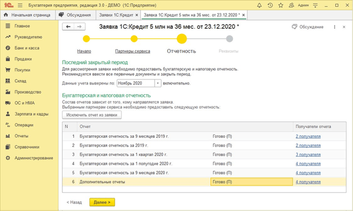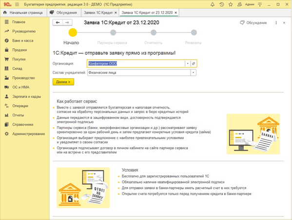 Для клиентов 1С:Бухгалтерия и 1С:БизнесСтарт использование сервиса создает ряд преимуществ по получению кредита:
